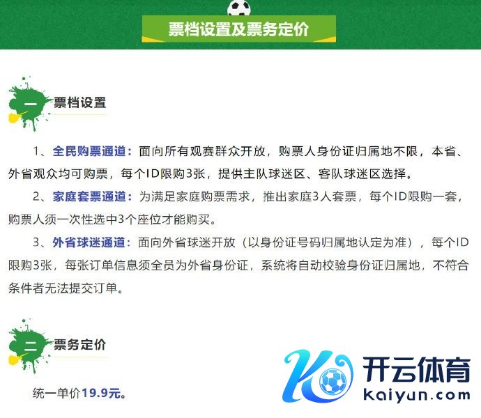 1、全民购票通谈:面向所有不雅赛全球洞开,购票东谈主身份证包摄地不限,本省、外省不雅众均可购票,每个ID限购3张,提供主队球迷区、客队球迷区选用。
