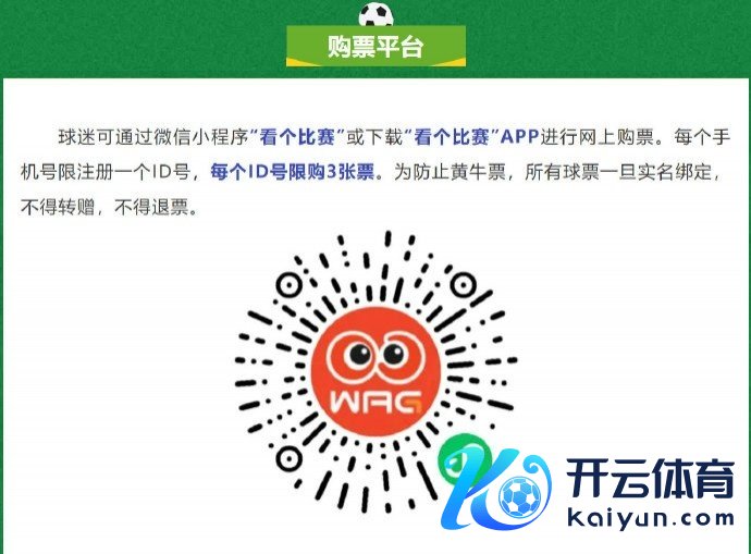 球迷可通过微信小形状"看个比赛"或下载”看个比赛”APP进行网上购票。每个手机号限注册一个ID号,每个ID号限购3张票。为退缩黄牛票,所有球票一朝实名绑定,不得转赠,不得退票。