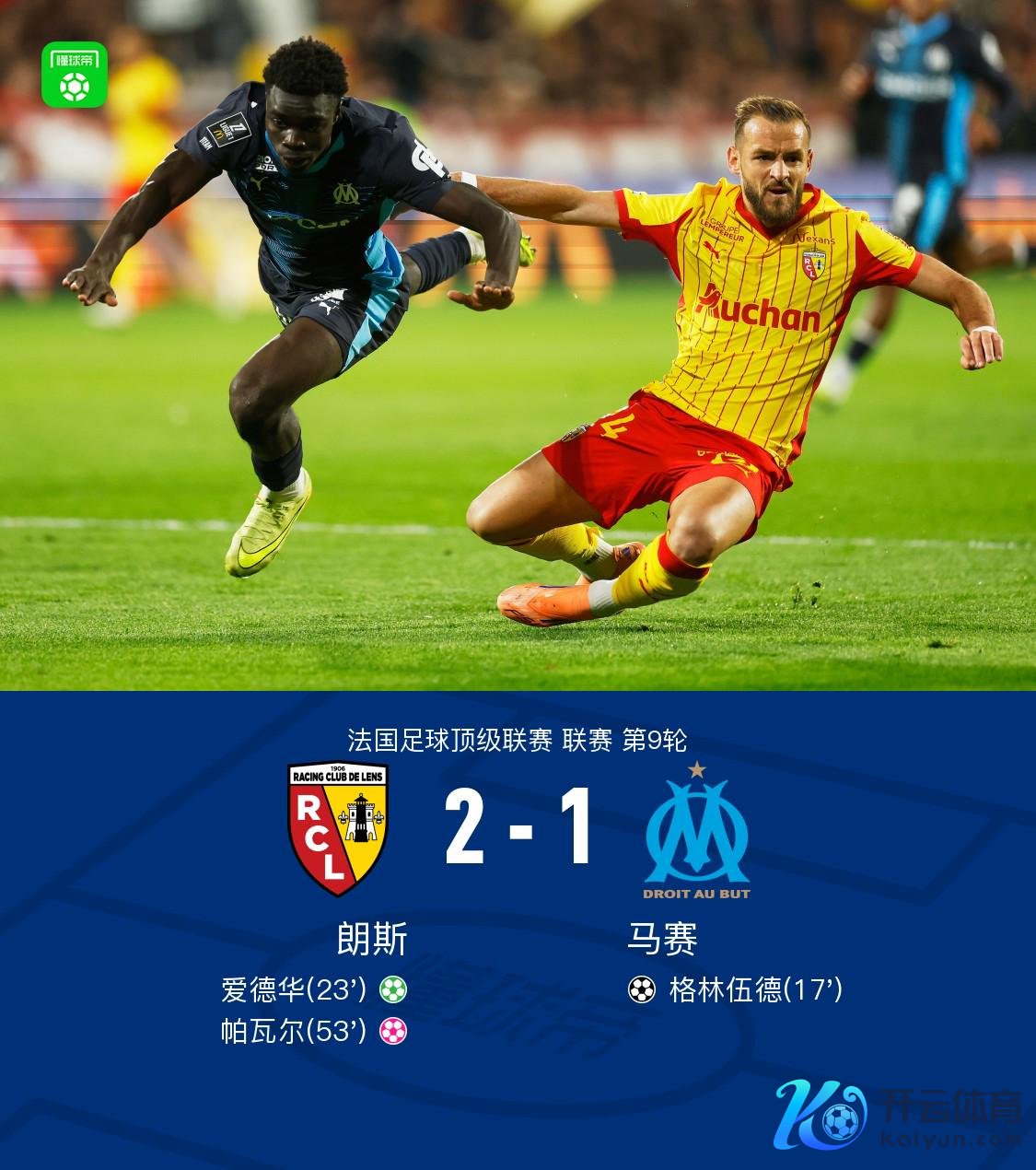 第53分钟,角球开出,乱战中帕瓦尔失慎乌龙,朗斯2-1马赛