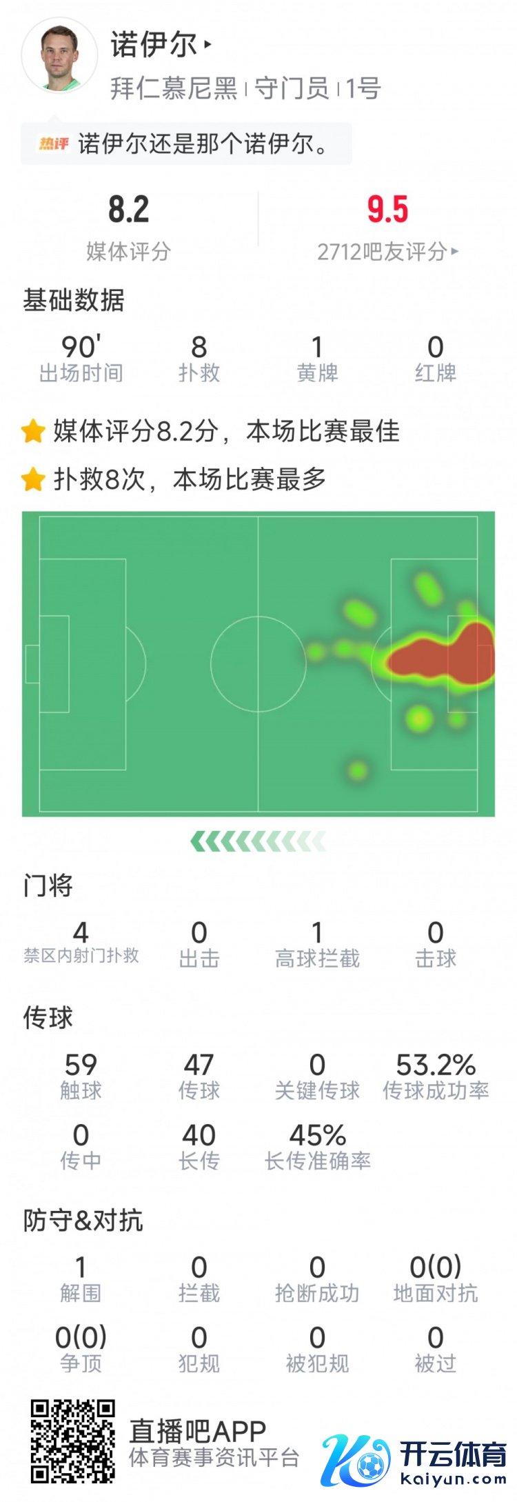 本场比赛诺伊尔在球队少打一东谈主的情况下通晓出色,全场孝敬8次扑救2024买球站体育信息,59次触球,传球收效力53%,1次突围,评分高达8.2分。