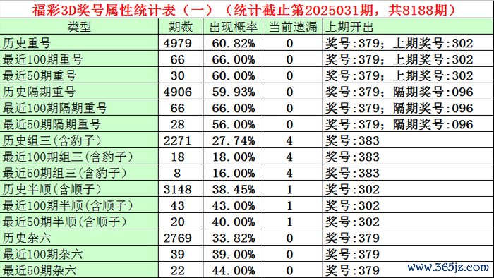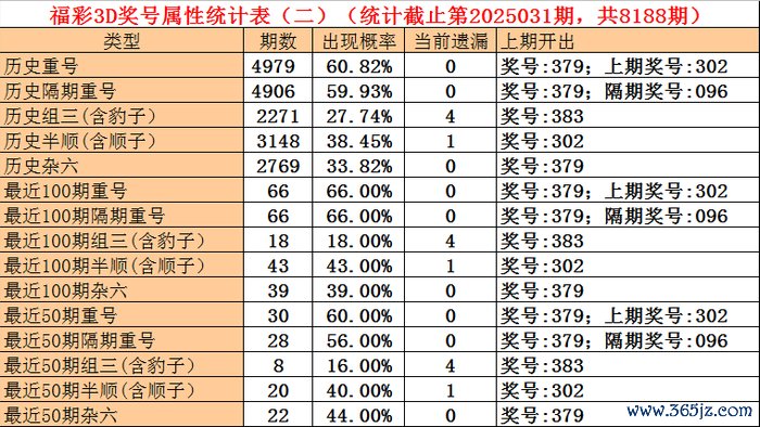 福彩3D上期奖号为379,上期开出重号3。最近100期重号开出66期,开出比例66%,最近50期重号开出30期,开出比例60%,最近10期重号开出 7期,出现比例为70%,本期扫视重号出现。