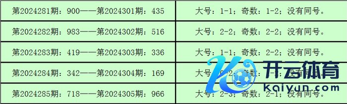 是以,3D第2024304期开出奖号:169,其大小比为2:1,奇偶比为2:1,012路比为2:1:0,与3D第2024306期奖号可能有同号。