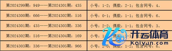 统计3D历史上已开出的奖号发现,在联络5期开奖号码中:3D在第2024299期-第2024303期差异开出奖号:949-666-435-516-336。