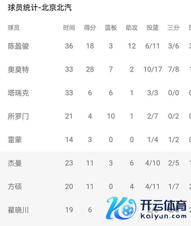 北京男篮方面:陈盈骏18分,3个篮板球,12个助攻;奥莫特得到28分和7个篮板球;塔瑞克拿下6个篮板球和6个篮板球;所罗门拿下4个篮板球,拿下4个篮板球;杰曼得11个,3个助攻,3个篮板球;方硕得11个,4个篮板,曾凡得9个。范子铭拿到6个积分,翟晓川拿到6个积分。
