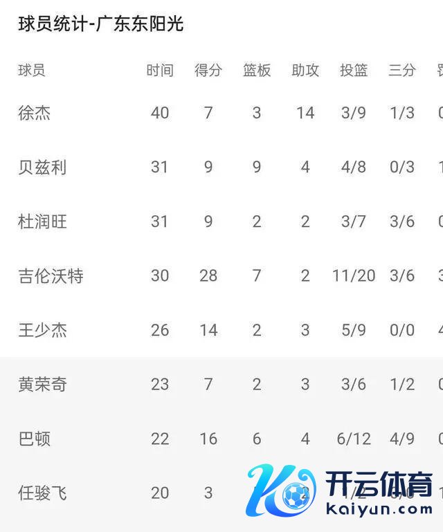 广东的比分:徐杰得到7分,3个篮板球,14个助攻;贝兹利拿下9分、9个篮板球和4个送出的助攻;杜润旺拿下9分、2个篮板球和2个助攻;吉伦沃特得到了28个篮板球和28个篮板球,王少杰得到了14分。巴顿拿下16分、6个篮板球和4个助攻;黄荣奇拿下7分、2个篮板球和3个助攻。