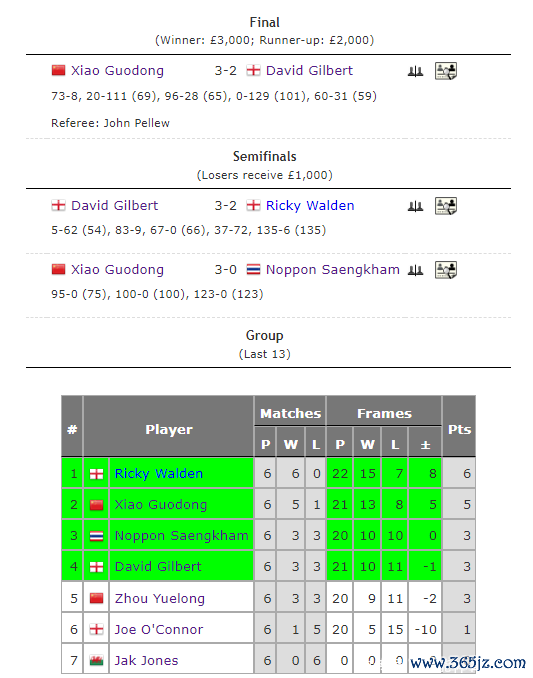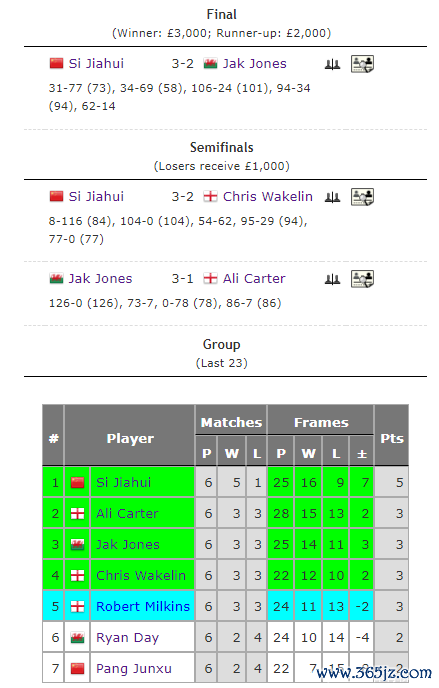 第二个出场的中国选手是时辰平面度13位的斯佳辉,他以5胜1负取得第二小组轮回赛的第别称。小组半决赛,他又以3-2征服克里斯韦克林。小组决赛,3-2打败杰克-琼斯夺得冠军。