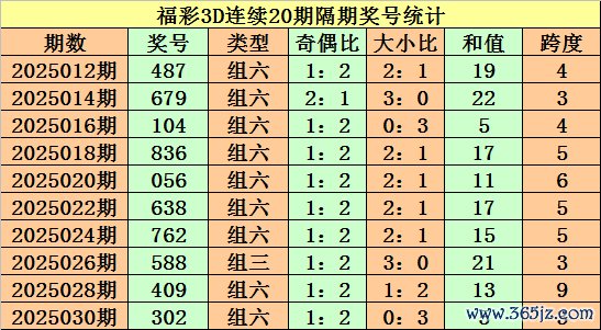 跨度:近5期跨度散布在3-9之间,振幅为7点,散布相配分散,上期跨度为6,高潮3点,本期戒备跨度类似出现。
