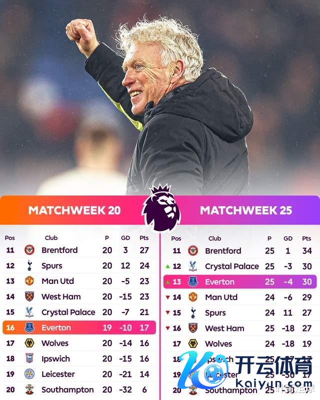 短短1个月,莫耶斯带队踢了6场英超,战绩是4胜1平1负,拿下13分!埃弗顿从第16蹿升至第13位,积分榜上越过西汉姆(25场27分)、曼联(24场29分)、热刺(24场27分),逾越左迁区13分之多,如故莫得保级压力。