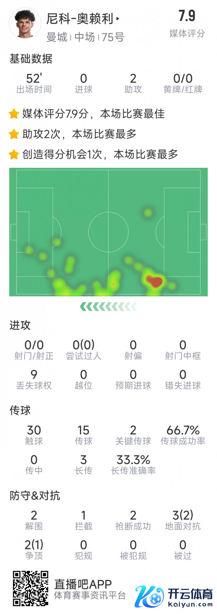 以下为他在本场数据:比赛技能52分钟2次助攻30次触球15次传球2次要道传球2次突围2次抢断1次禁绝5次抗争3次得胜评分7.9分 体育集锦