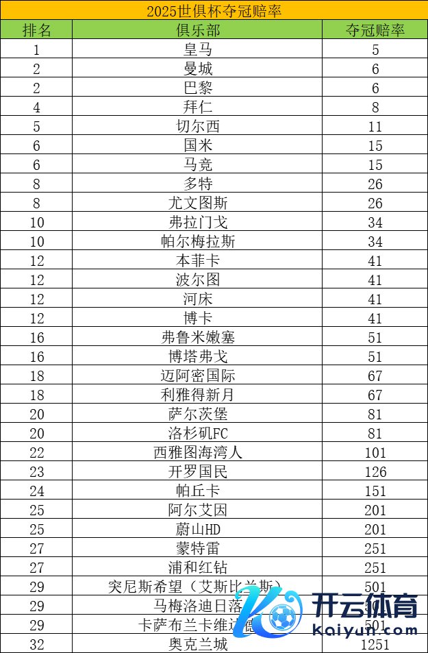 北京期间6月15日(周日)上昼8点,2025年海外足联世俱杯揭幕战行将打响,32强均已引而不发。扩军后的首届世俱杯左近,海外机构更新了2025世俱杯夺冠赔率,皇马以1赔5力压曼城位居第1,新科欧冠冠军大巴黎和曼城并排第2(1赔6),拜仁1赔8位居4,国米、尤文、多非常队惟恐将是“浪掷走动一场空”。