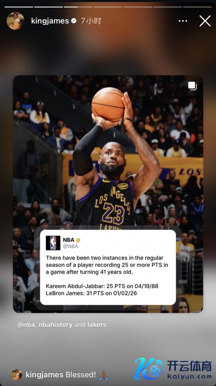 NBA官方账号发布了詹姆斯卓绝贾巴尔(25分),创造了NBA球员41岁后历史最高单场得分的记载。詹姆斯转发并写说念:“很红运!🙏🏾”