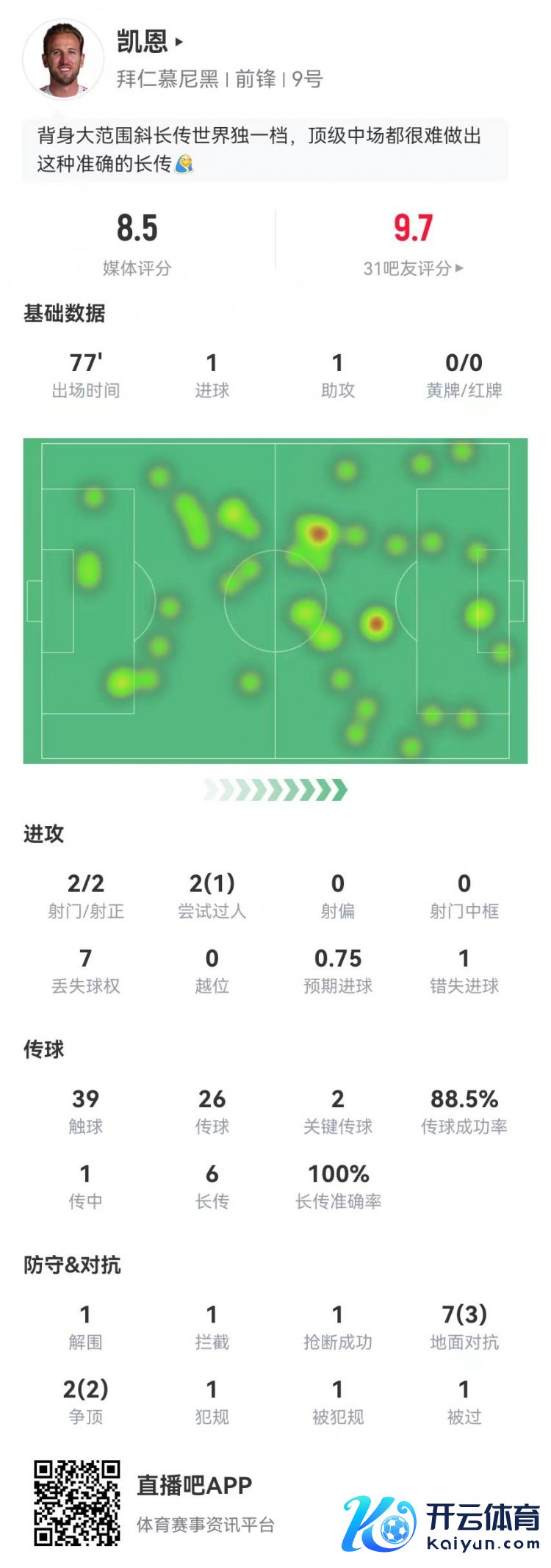 1月12日讯 拜仁在本轮德甲7-1培育狼堡,凯恩本场数据如下: