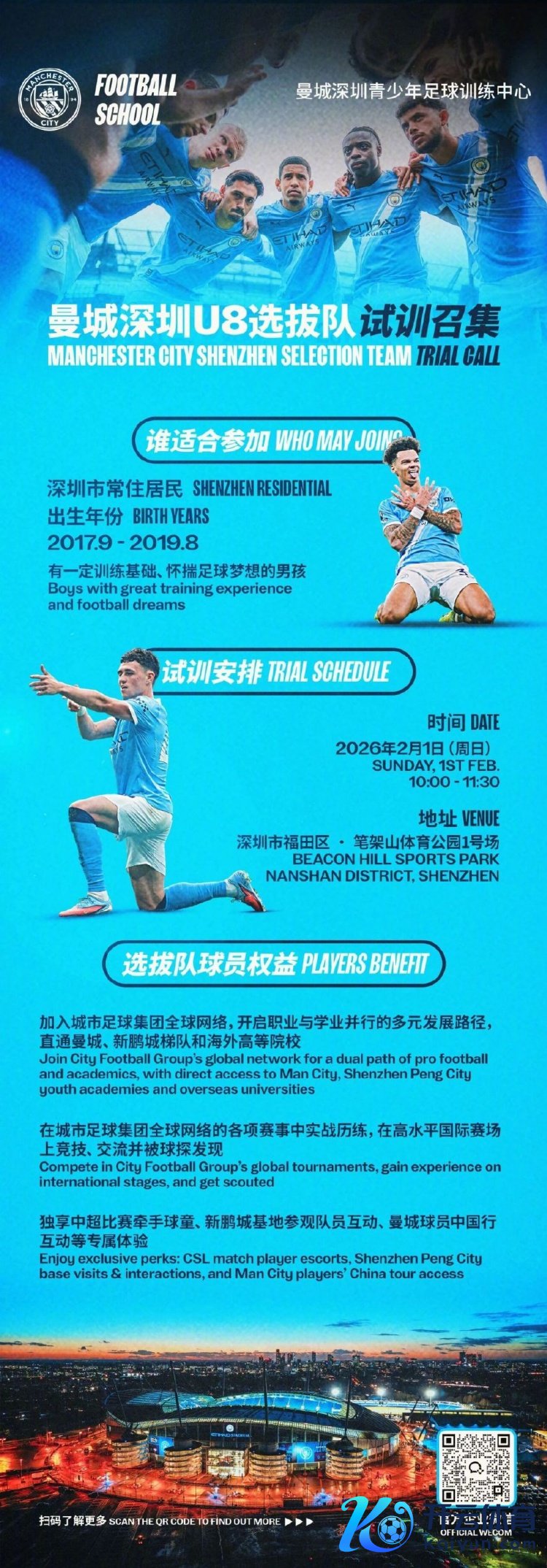 1月15日讯 当天,曼城官方微博发布曼城深圳U8聘用队试训召集公告,招募出身年份在2017年9月至2019年8月之间出身的深圳市常住男孩参加试训,时期是2026年2月1日体育录像/图片,处所是笔架山体育公园。