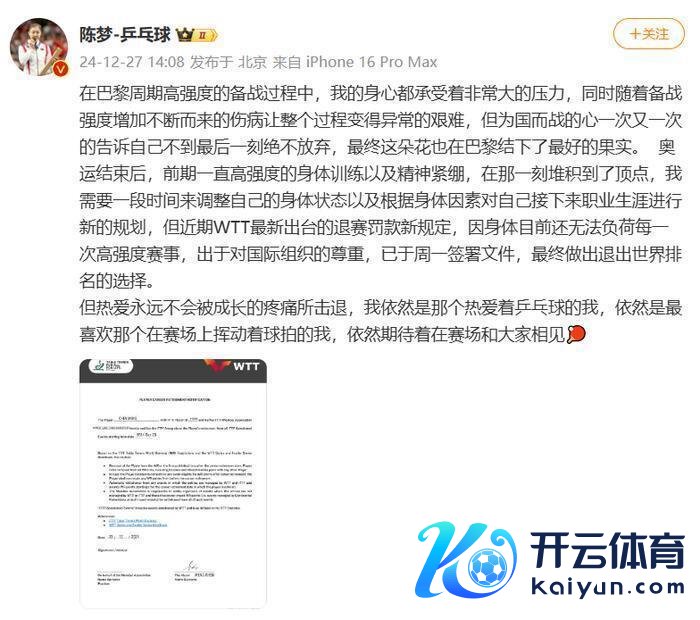 北京时辰12月28日音问,2届奥运会女子单打冠军“大梦”陈梦晓示退出天下排行体育录像/图片,登上热搜榜。她在个东谈主外交平台上写谈:“期WTT最新出台的退赛罚金新表率,因身体刻下还无法负荷每一次高强度赛事,出于对海外组织的尊重,已于周一签署文献,最终作念出退出天下排行的遴荐。”