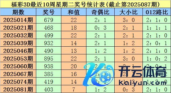 福彩3D第2025081期(上周星期二)奖号为403。其中奖号奇偶比为1:2,大小比为0:3,012路比为2:1:0。