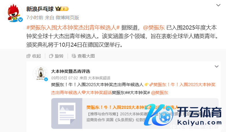 大本钟奖是全球华人精英后生限度的盛名奖项,旨在奖赏在不同限度取得凸起成立的华人后生,该奖项设有伊丽莎白奖、金独角兽奖、金桑树奖、神工奖、赫拉特勒斯奖等多个子奖项,隐敝政事、经济金融、文化、学术老师、科技和体育等限度,2025年度的授奖仪式将于10月24日在德国汉堡举行,已往获取这一荣誉的包括盛名斯诺克选手傅家俊、文体大师金庸、歌手陈奕迅以及获取文静畴昔奖的跳水通顺员全红婵等人,樊振东约略入围这一奖项的候选人名单,不仅是对他体育成立果然定,更是对他行为又名海外级通顺员展现出的做事精神和个人品性的高度招供