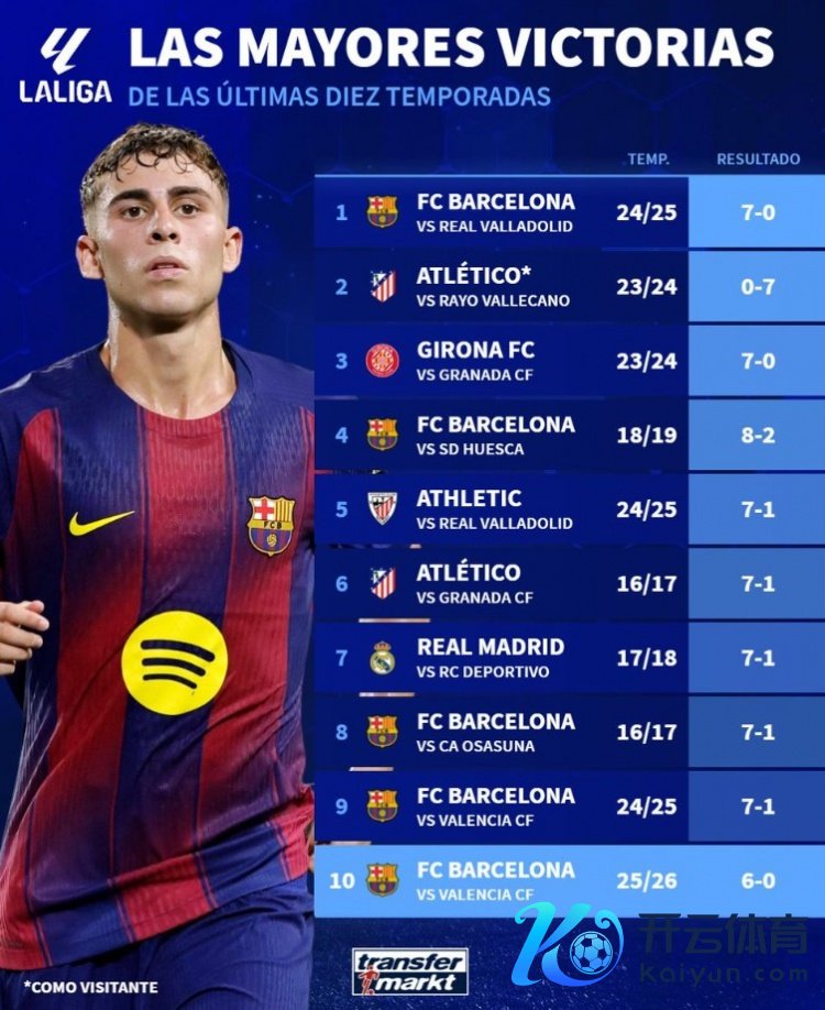 9月15日讯 西甲第4轮比赛,巴萨在主场以6-0的比分大捷瓦伦西亚。本年1月,红蓝军团曾以7-1的比分大捷相似的敌手。德国转会商场盘货了西甲近10赛季最大比分赢球top10,巴萨5次上榜。