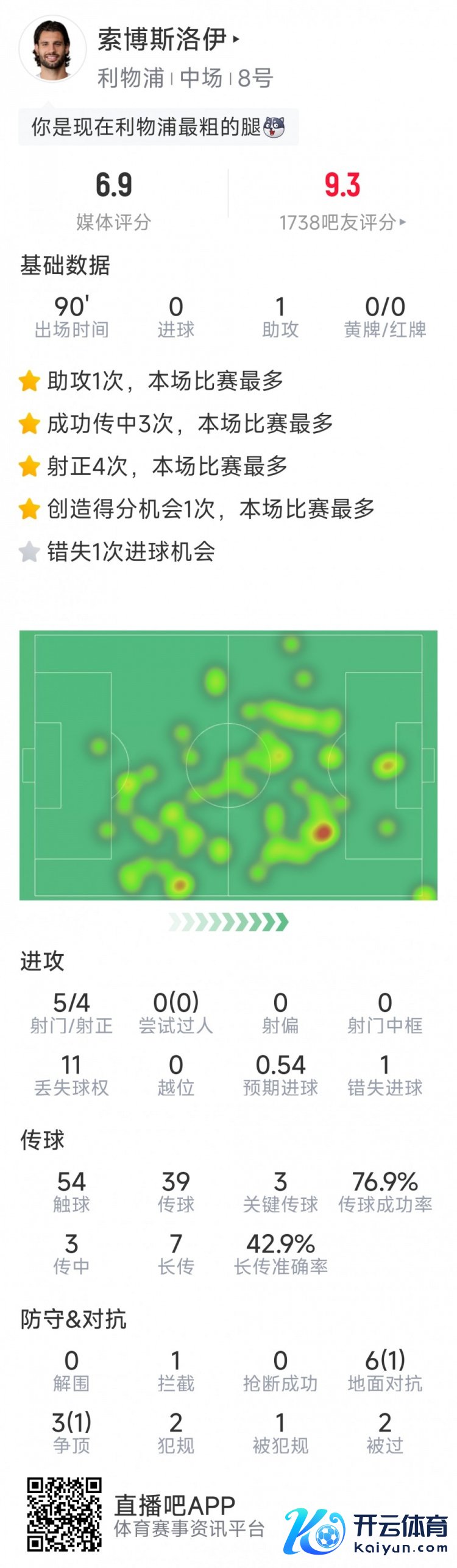 11月5日讯 在本轮欧冠,利物浦1-0皇马,以下为索博斯洛伊本场数据: