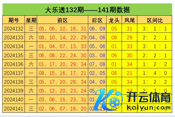 大乐透第2024141期出奖号统计:前区02 06 07 16 20,后区02、11,和值为51,跨度18,龙头02凤尾20,三区比为3:2:0,012路比为1:2:2,奇偶比为1:4,大小比为1:4体育赛事直播,冷热比为2:3,1枚重号,1组连号。