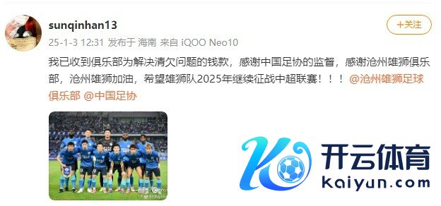 孙沁涵写说念:“我已收到俱乐部为处分清欠问题的钱款,感谢中国足协的监督,感谢沧州雄狮俱乐部,沧州雄狮加油,但愿雄狮队2025年继续诞生中超联赛!!!”