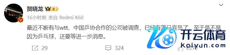 近半个月国内各大官方媒体对樊振东、陈梦的“退赛风云”都进行了抓续报谈,其中央视多个频谈更是超越显著地标明了力挺樊振东陈梦以及诽谤WTT的格调,这么的风向也让身兼WTT宇宙乒联董事会主席、中国乒协主席以及外洋乒联第一副主席的刘国梁备受质疑,但是愈加劲爆的是,北京时辰1月7日晚,着名媒体东谈主贺晓龙在酬酢平台上爆料:近期束缚有与WTT和中国乒协互助的公司被拜访体育赛事直播,何况如故有官员因此落马,但至于是不是跟乒乓球名目有着径直相干,当今还需要恭候进一步音信!那么贺晓龙这则音信至少从侧面反应出,如今针对中国体坛的反腐手脚,如故伸向了国乒