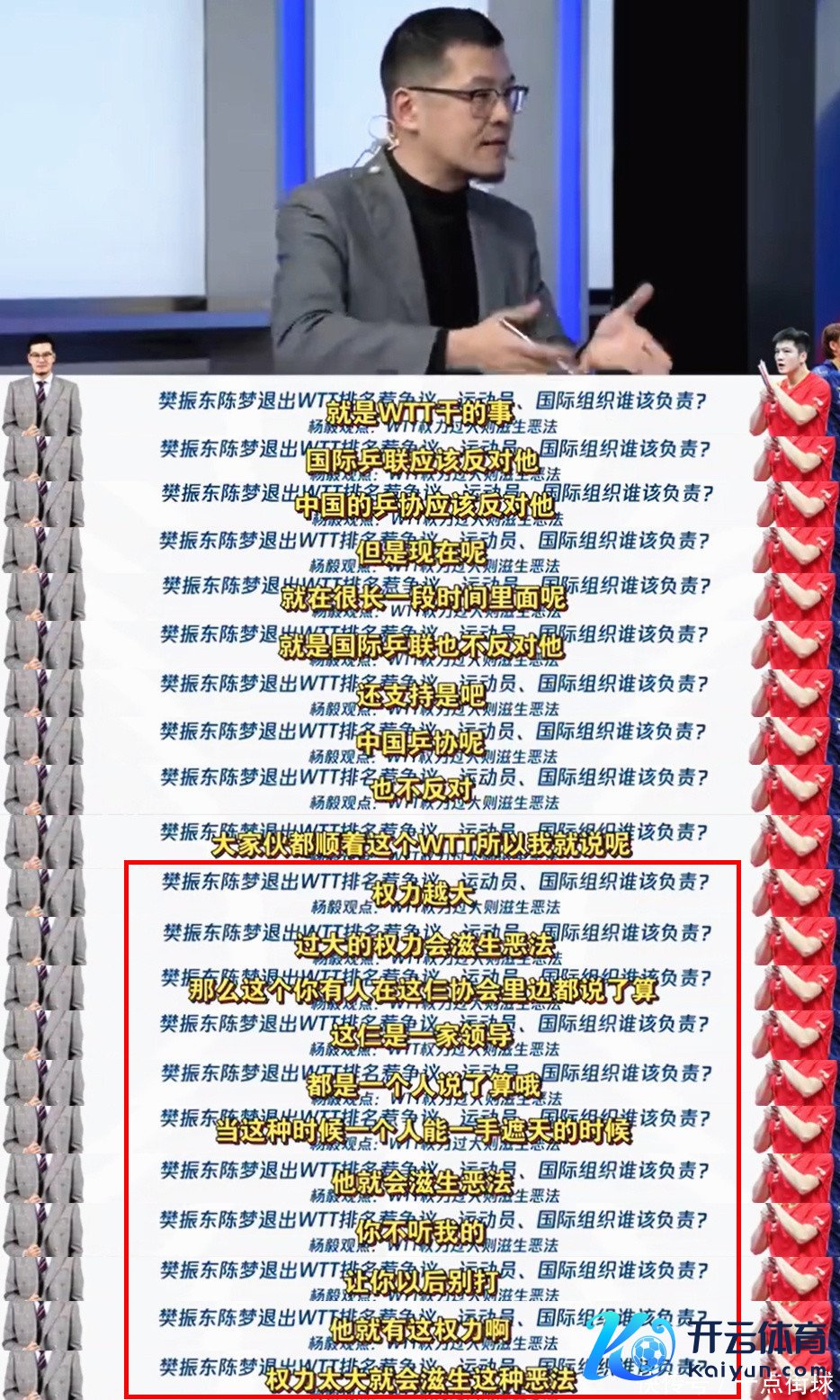 但是推断连刘国梁都未尝念念到的是,底本局限在WTT司法界限内的事件,跟着收罗的发酵,人人挖出了更多对于WTT赛事不对理的地点,尤其是资金着手更是众说纷纭,随后着名体育媒体东谈主杨毅在《有球必应》节目中,更是公开炮轰身兼三职的刘国梁,宣称过大的权力会生息恶法,当三个协会都是一个东谈主说了算,那么这种期间一手遮天就定会生息恶法!言辞敏感让繁多网友王人声奖饰,由于杨毅在体坛诠释圈的影响力,这件事情的存眷界限,如故不局限在WTT司法那么浅薄了