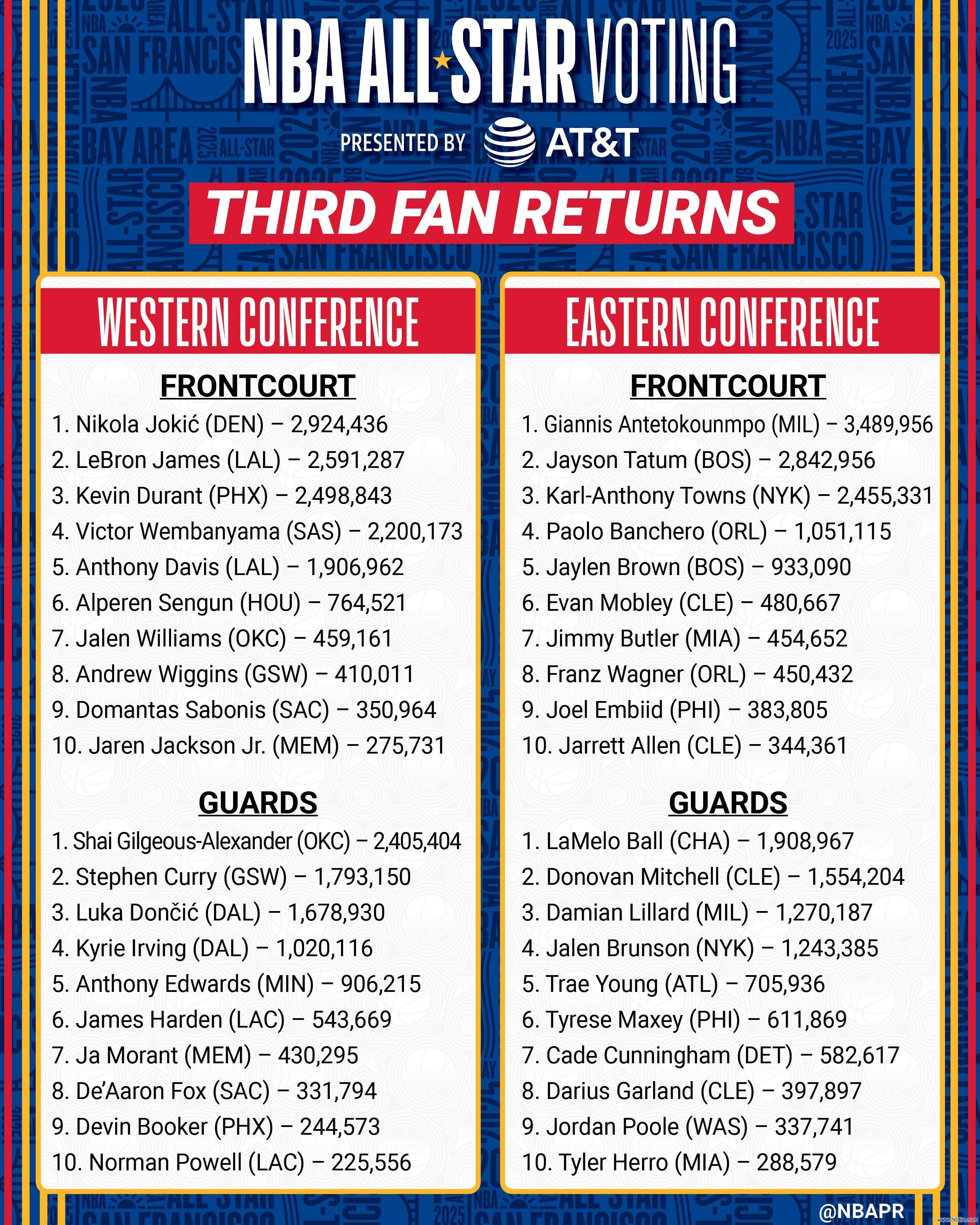 01月17日讯 NBA官方公布了2025年旧金山全明星周末第三阶段球迷投票后果,字母哥蝉联票王,约基奇延续领跑西部,詹姆斯卓绝杜兰特升至西部前场次席,亚历山大跳跃西部后场,东部后场得票最高的依旧是三球。