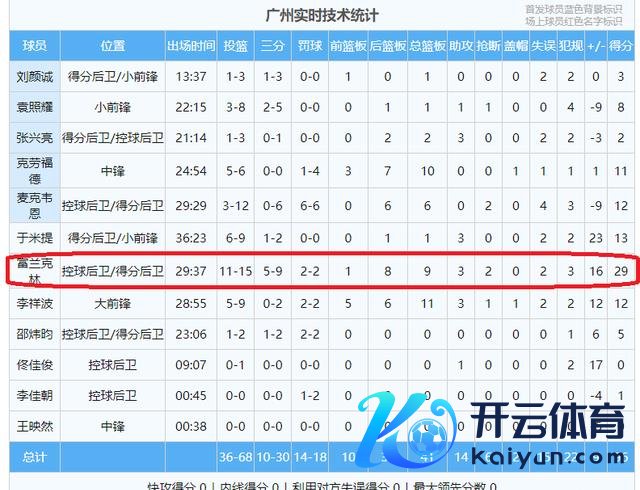本场比赛,富兰克林替补出场,一共打了29分37秒,投篮15中11,射中率达到了七成三,其中,三分球9中5,砍下了全队最高的29分,外加9篮板3助攻2抢断的惊艳数据。正负值为+16,毫无疑问,富兰克林即是广州队赢球的最大元勋。在此,亦然不得不说,广州队签约富兰克林,似乎又是赌对了。